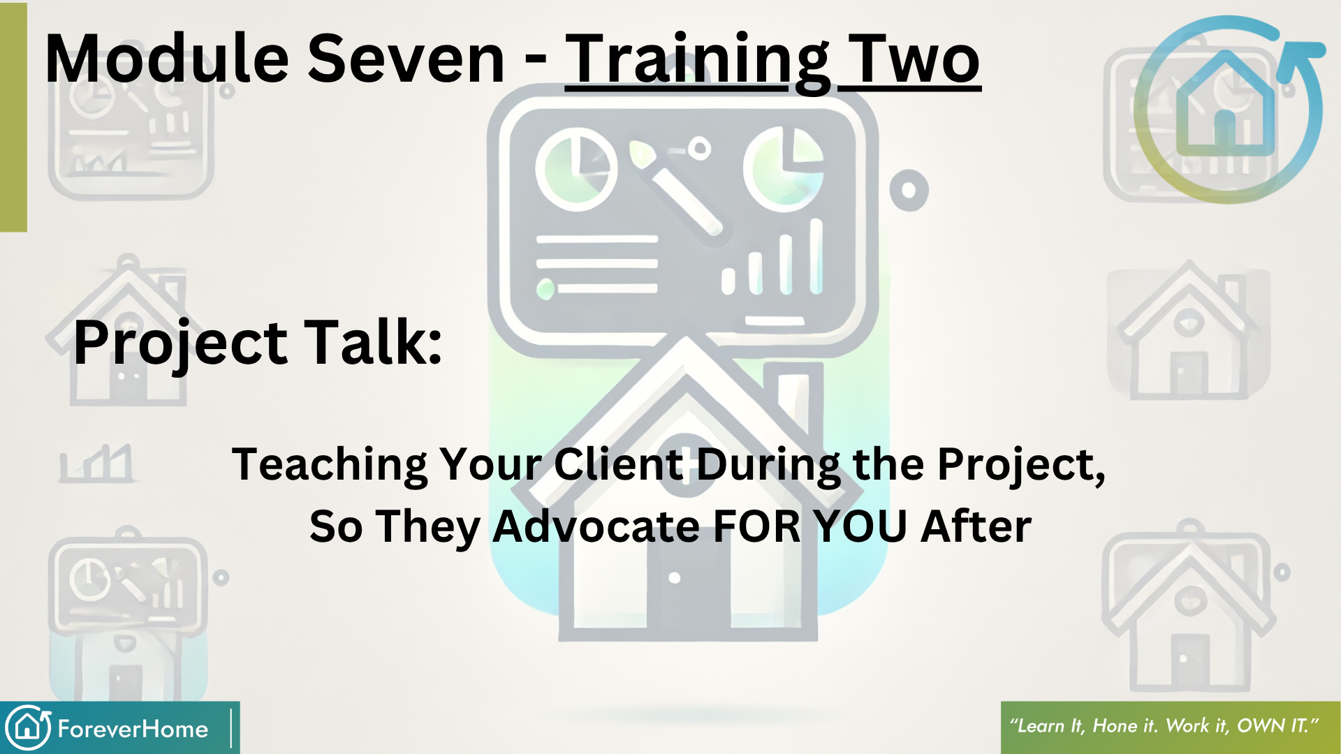 Description: Educating your clients during your project is one of the most important future business (pipeline feeding) work you can do with your active and current clientele. During a project timeline, educating your clients helps ease their minds, protect them from (unfounded) worries, and offers the client and their family members peace during a tough “bridging” phase from old standard ways to new and better ways of thinking and living in their own homes. By providing them with new (and empowering) knowledge about their own project during your time together, they’re better “sales team” members for you in the future when their project is completed. When they are happy with you and the results you provided them, they’ll also understand better what we accomplished, when telling their own friends and family about your company. A client who’s armed with education will tell more people about their experience with your company, the solutions and outcomes you provided for them successfully. They’ll express their joy and peace of mind with everyone that comes to their home, and whenever the subject matter comes up with friends and family. Your phone will ring as a result, with less (or $0) ad spend and marketing expenses to your company, making you more profitable.